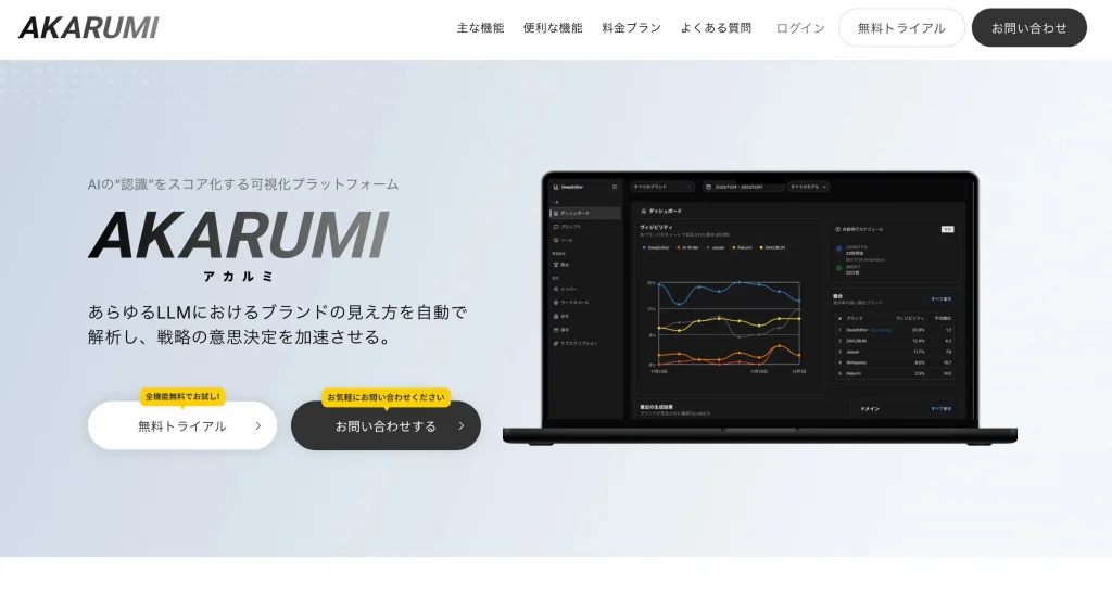 AKARUMI(アカルミ)は、ChatGPTなどの主要なLLMや、AIOにおけるブランド価値の状況を可視化できる国産の分析ツールです。