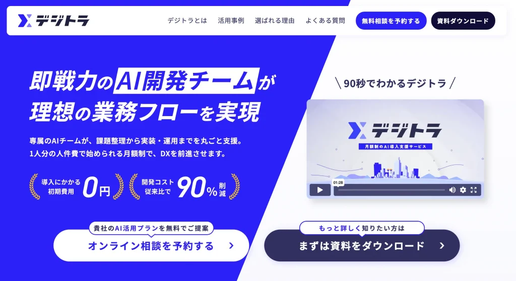 デジトラのサービス内容は、AI導入を検討する企業に対して、専属のAI開発チームが伴走支援する月額制のAI導入支援サービスです。
