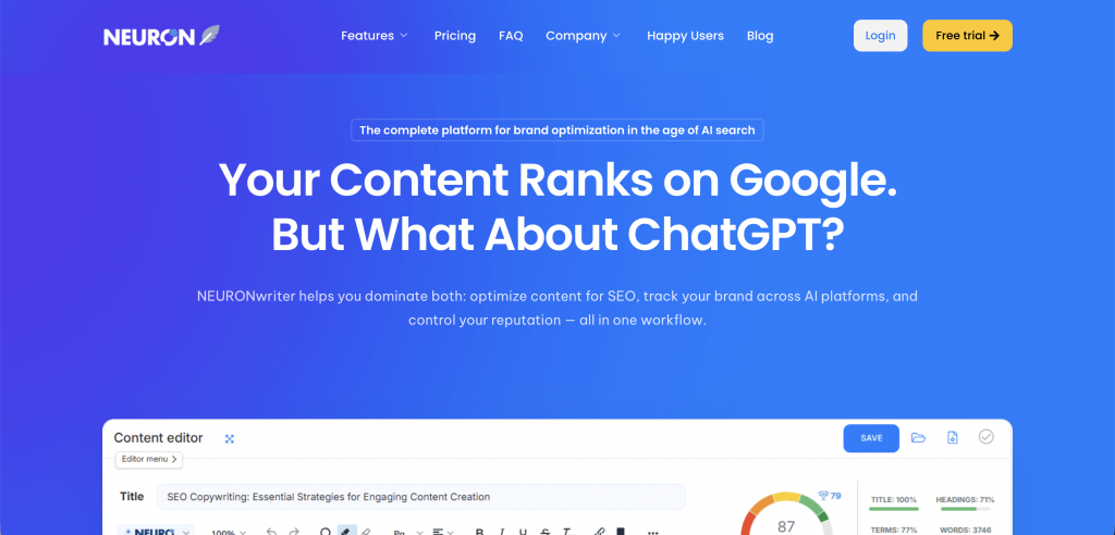 | NeuronWriter | NLP(自然言語処理)に基づく記述。AIが理解しやすい記事作成を支援。 | Bronze :約3,600円 Silver:約7,000円 Gold:約10,700円 Platinum:約14,500円 Diamond:約18,200円 | コスパ重視、個人~中小企業 |