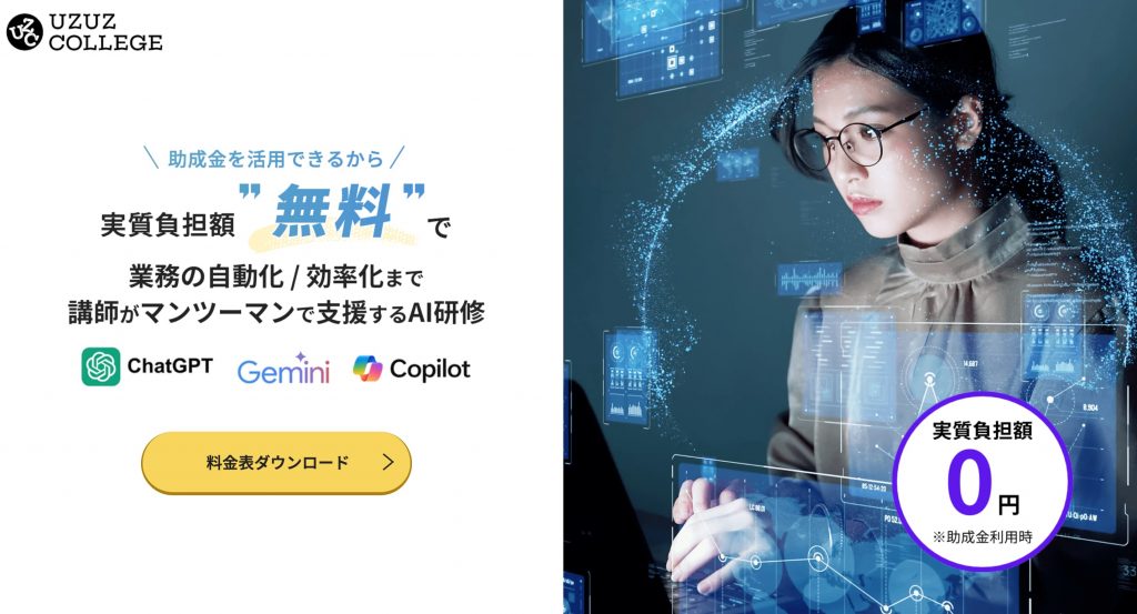 株式会社UZUZ COLLEGEの「AI人材育成コース」は、助成金活用により実質無料で導入できる、現場直結型の伴走型AI研修です。