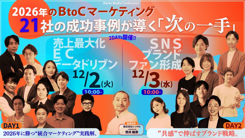 | 概要 | 2026年のBtoCマーケティング 21社の成功事例が導く“次の一手” 【DAY1】2026年に勝つ“統合マーケティング”の実践解 【DAY2】“共感”で伸ばすブランド戦略 |