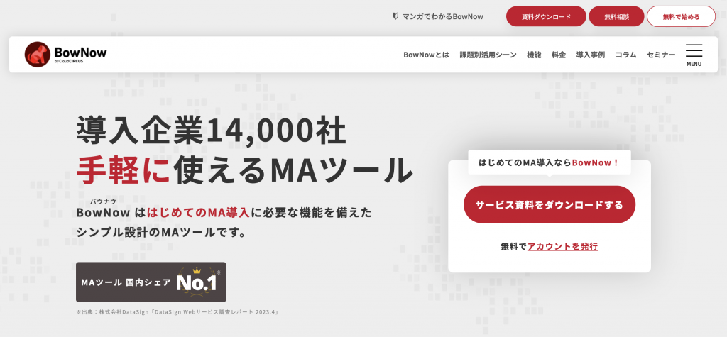 | BowNow | 無料プランあり。国産MAツール導入数No.1。ABM(アカウントベースドマーケティング)特化でリスト自動作成やデータ可視化が強み。低コスト・初心者向け設計。 | フリー:0円 エントリー:10,000円 ライト:20,000円 スタンダード:30,000円 ビジネス:問合せ(最低利用期間1年、各機能ごと課金可) | https://bow-now.jp/ |