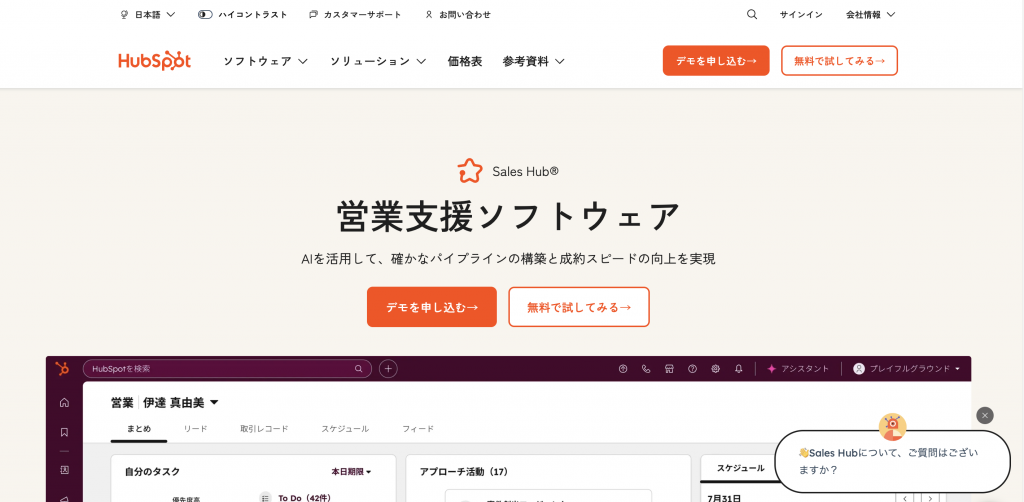同社のMarketing Hubとの統合が非常にスムーズで、マーケティングから営業への情報連携(MA→SFA)が自然に設計できる点が大きな強みです。無料プランで気軽にスタートできる上に、導入1年で取引件数が12%増加した実績もあります。