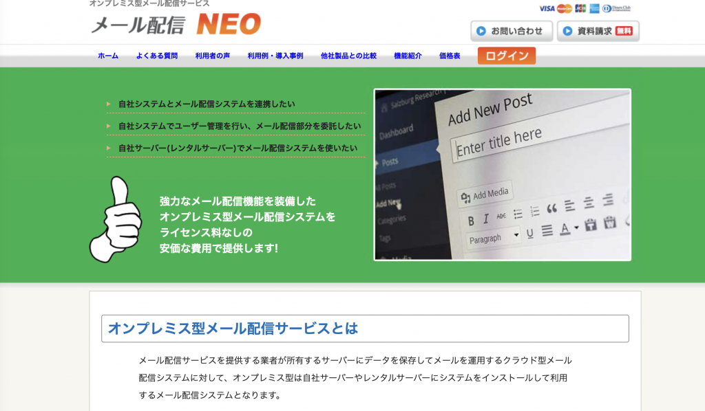 メール配信NEOは、オンプレミス型のメール配信システムをライセンス料なしの低価格で提供している特徴的なメール配信サービスです。