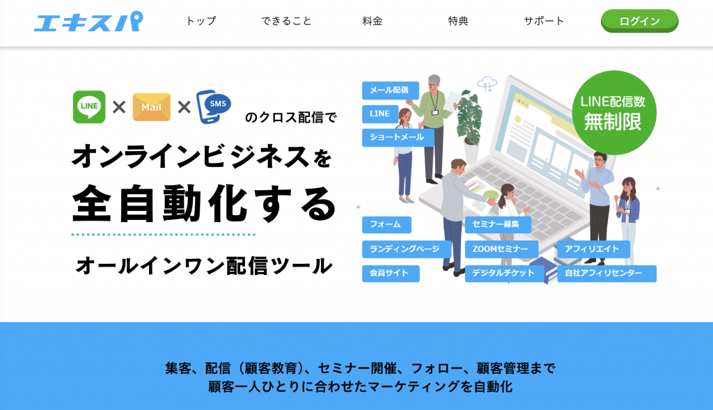 エキスパは、メール、LINE、SMSを組み合わせて顧客に最適なコミュニケーションを行うことのできる、ハイブリッド型配信ツールです。
