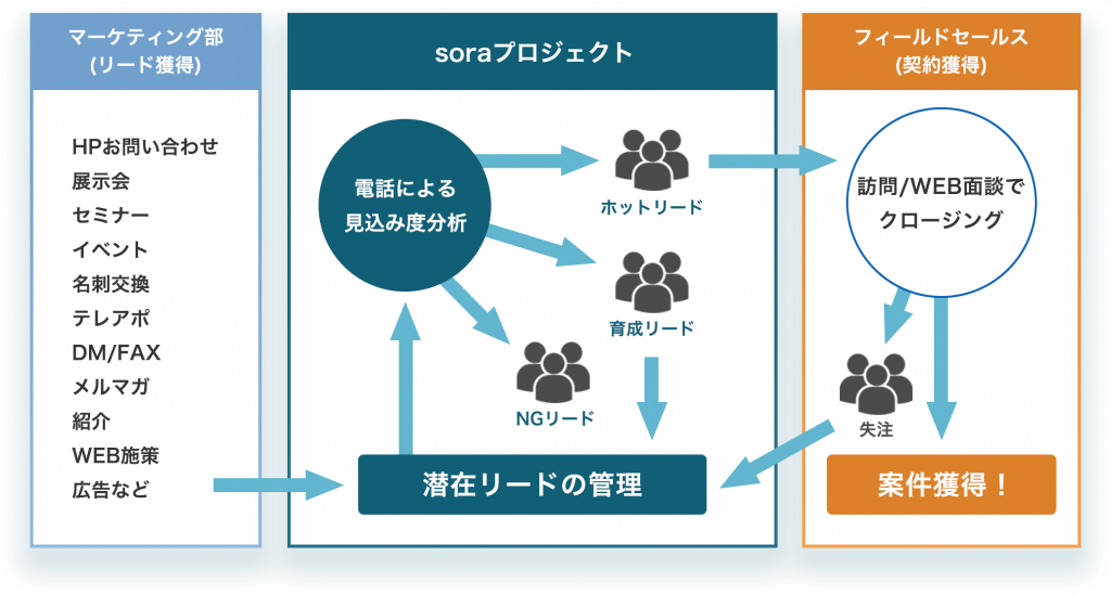 | 株式会社soraプロジェクト | 成果報酬型 | ・最短3日で開始可能 ・独自の法人データベース保有 | スピード重視で始めたい企業 |